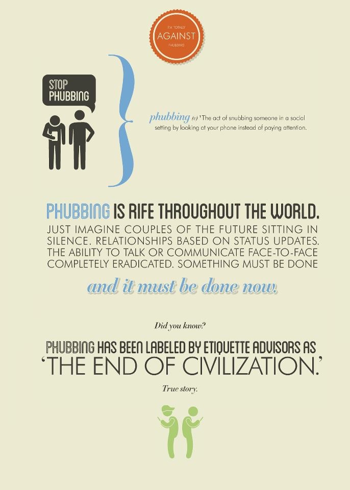 De unos años para acá, a todos nos ha tocado ser víctimas de un nuevo comportamiento psicológicos llamado PHUBBING, un término formado a partir de las palabras phone y snubbing y no tiene mayor definición que el acto de menospreciar a quien nos acompaña al prestar más atención al móvil o a otros aparatos electrónicos que a su persona.